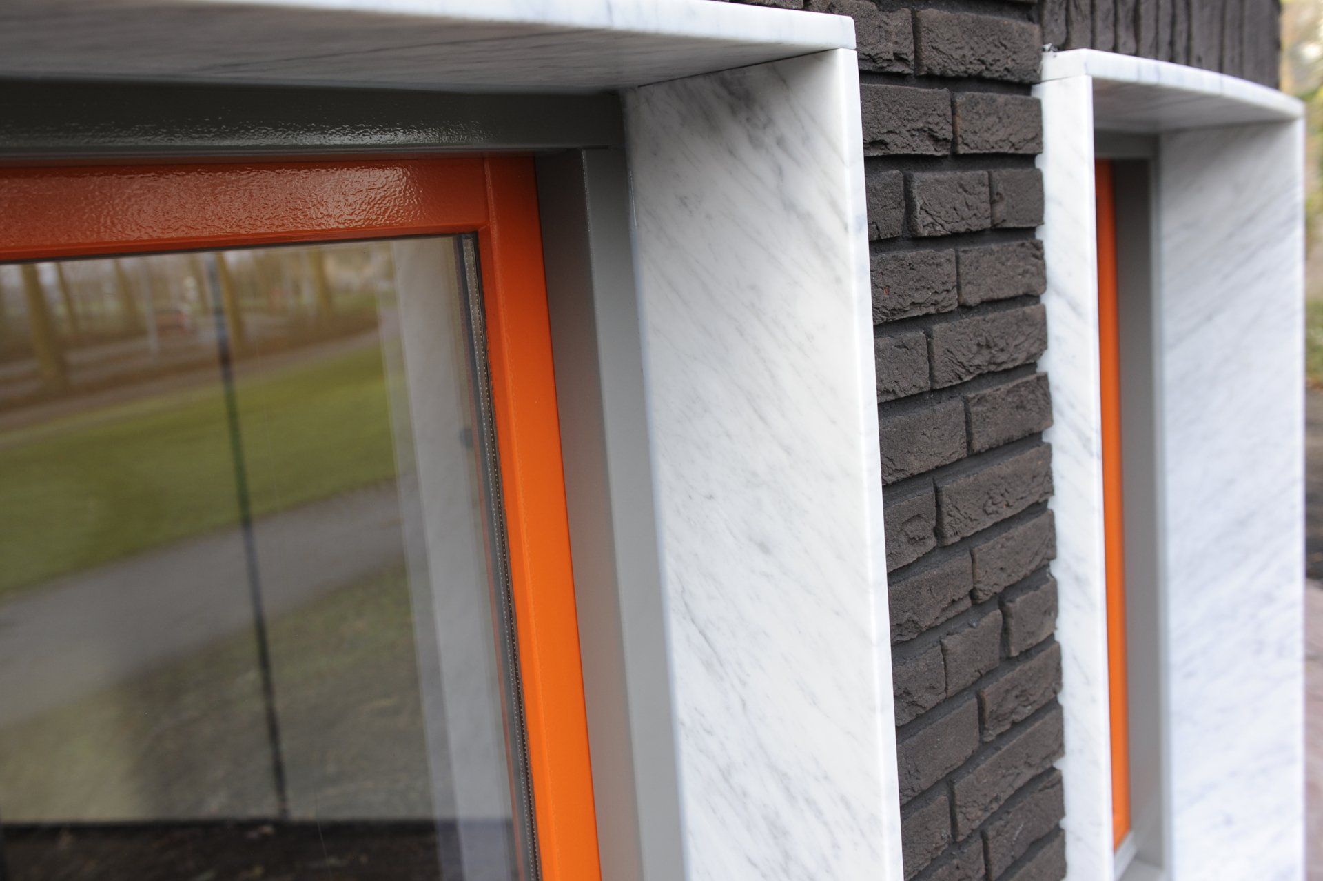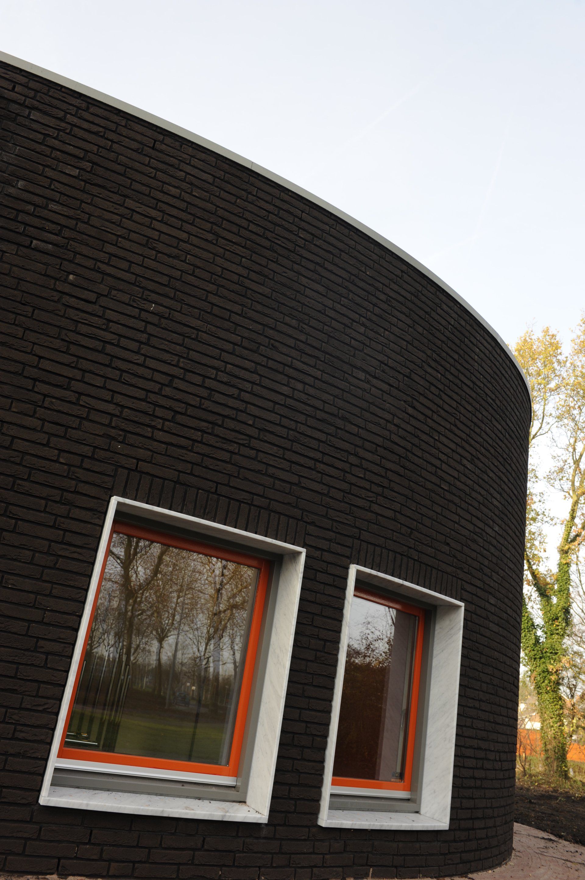 Het donkere metselwerk met willekeurige geplaatste kozijnen oogt massief en gaat in zijn omgeving, de binnenzijde oogt licht en fris.